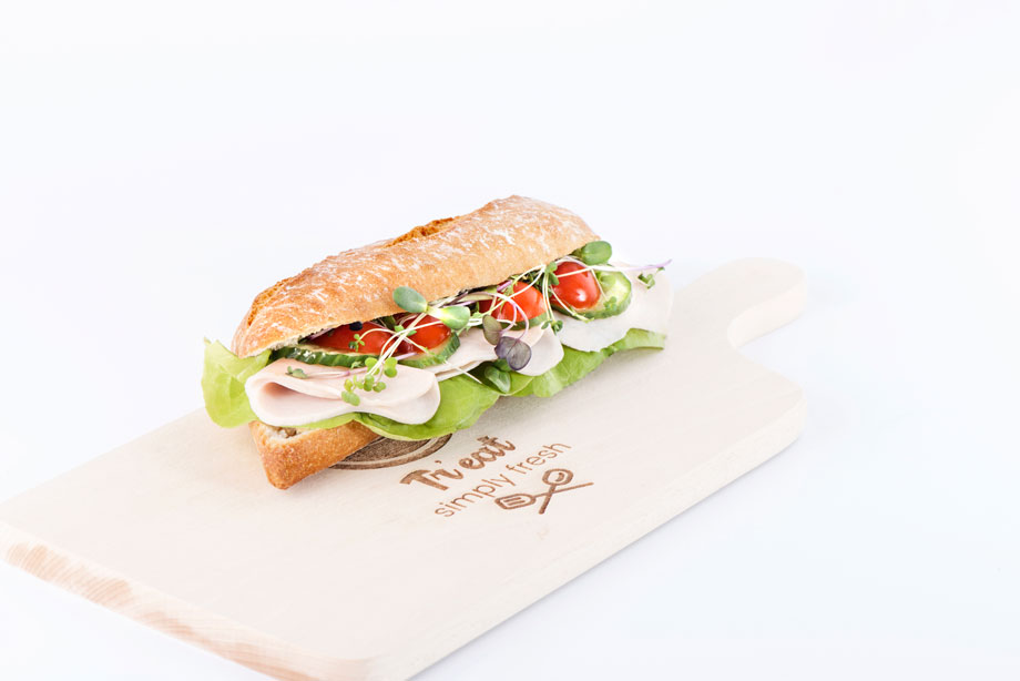 Mancarea se gusta cu sufletul. Atunci cand el cere o portie savuroasa de sandwich, care sa poate fi suficienta pentru o masa, se refera la produsele noastre cu topping-uri rafinate de care ti se face pofta oricand. De aceea, ne alaturam tie si iti prezentam feliile fragede de jambon de curcan pe un pat de crema de unt, inconjurat de un mix de salata cu vlastari pe un strat de pasta de masline kalamata, rosii cherry si castraveti, plus un varf de condimente.