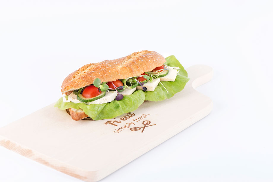 Mancarea se gusta cu sufletul. Atunci cand el cere o portie savuroasa de sandwich, care sa poate fi suficienta pentru o masa, se refera la produsele noastre cu topping-uri rafinate de care ti se face pofta oricand. De aceea, ne alaturam tie si iti prezentam un amestec de tofu afumat si tofu sarat pe un pat de crema de unt, inconjurat de un mix de salata cu vlastari, rosii cherry si castraveti, plus un varf de condimente peste un dressing cremos si delicios.